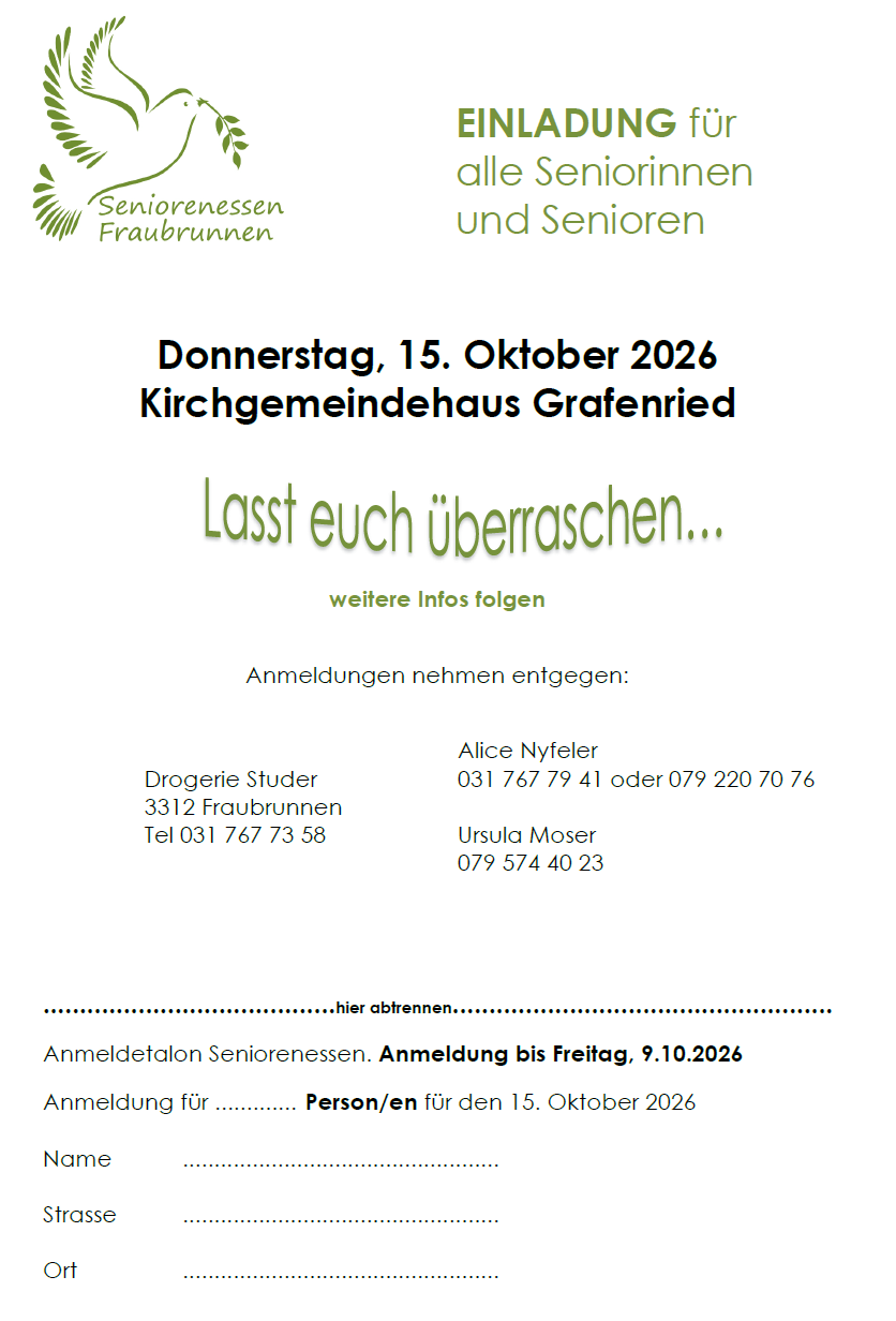 Seniorinnen und Senioren jeden Alters aus Fraubrunnen und Umgebung sind herzlich eingeladen. Wir treffen uns paarmal im Jahr in den Restaurants von Fraubrunnen und Grafenried zum Essen und Plaudern. Zum Programm gehören auch Darbietungen verschiedener Art, z.B. Filme ansehen, Musik hören usw.